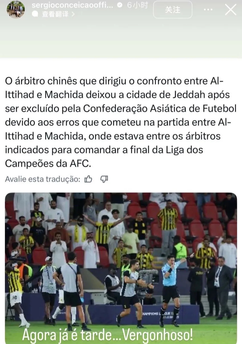 值得注意的是,吉达联合主帅孔塞桑,在个人社交媒体上还转发了马宁结束亚冠执法任务的新闻,这位前米兰主帅气愤评论道:“现在处罚他已经太晚了,真是可耻!”